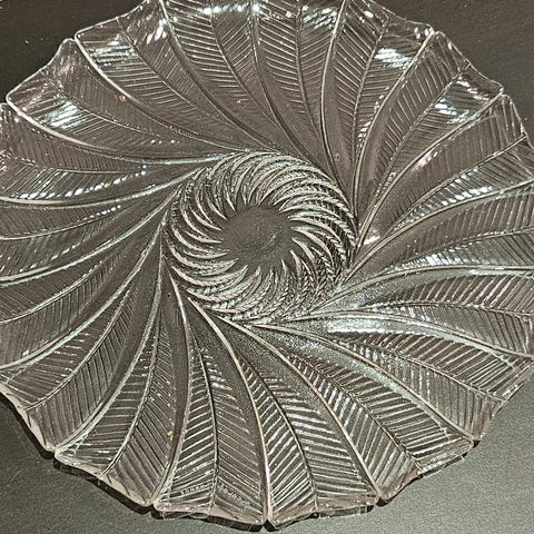 Selger et vintage serveringsfat i grønt depresjonsglass. Sannsynligvis fra 1930-tallet, men ikke noe jeg kan garantere. Ingen merke under fatet. Bredde: 33cm.