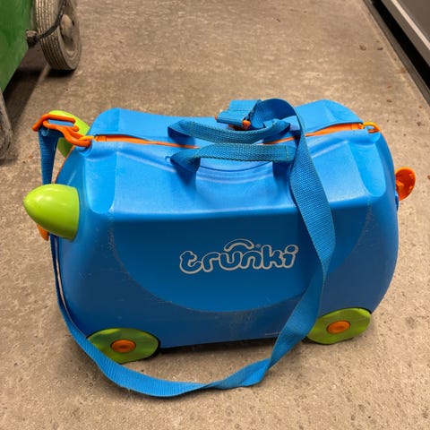 Liten koffert til barn. Kofferten er laget for at det skal bli en lek å reise for de minste - barnet kan enten sitte på kofferten og sparke seg fremover eller bli dratt av andre.