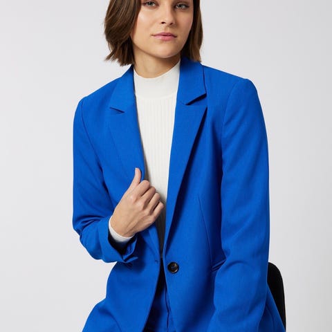 Blazer i rett kort modell av behagelig resirkulert polyester kvalitet med innvevd lurextråd. Blazeren har dekorative perleknapper, råkanter, fuskelommer med knapp på brystet og knappelommer i front. Innvendig delikat fôr og rett ermavslutning.
