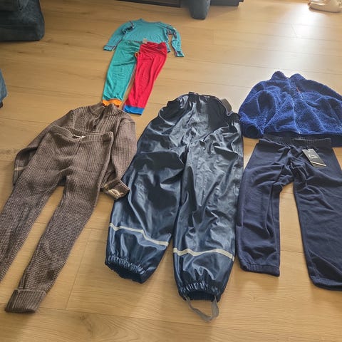 Ulltøy og ytterklær i 110, 116 og 122/128. Brukt på samme tid. Noe er lite og fint brukt, noe en del brukt og noe godt brukt. Se beskrivelse på bilder.