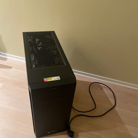 Komplett stasjonær PC med svart kabinett og rødt lys.