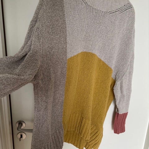 Søt genser i grønt og hvitt, med stripemønster. Liten splitt i siden, kortere foran enn bak, se bilder.
