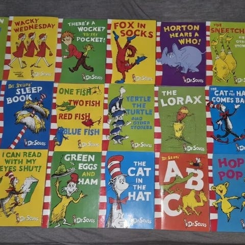 Dr. Seuss barnebøker samling. Baksiden viser flere klassiske titler i serien, med fargerike forsider og illustrasjoner. Bøkene er egnet for barn som begynner å lese selv eller til høytlesning for yngre barn. Innholdet består av korte historier med rim, enkle setninger og illustrasjoner på hver side. Språk: engelsk.
