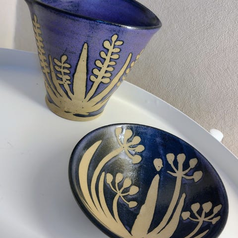 Håndblåst glass med håndmalt sommerfugldekor i blått, grønt og rødt. Ett lite fat/bolle (9 cm diameter) og en liten skål (5 cm diameter).