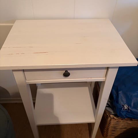 Nattbord selges. Noe bruktslitasje og den har fått litt dekkover ved synlige hakk for å kamuflere det best mulig. Fungerer ellers som den skal. Målene fremkommer på bildene