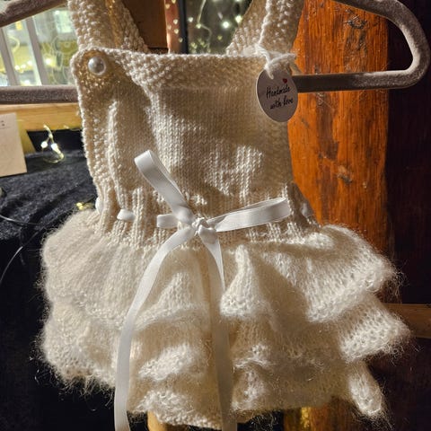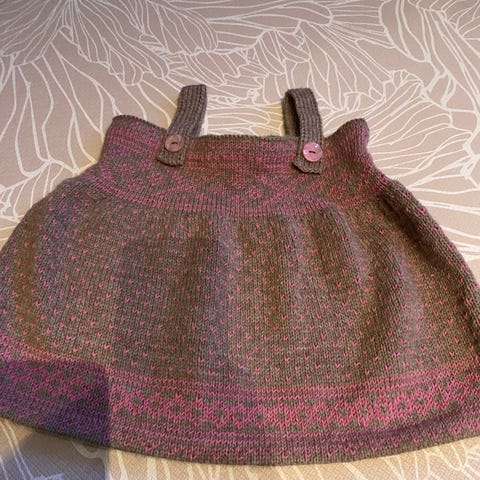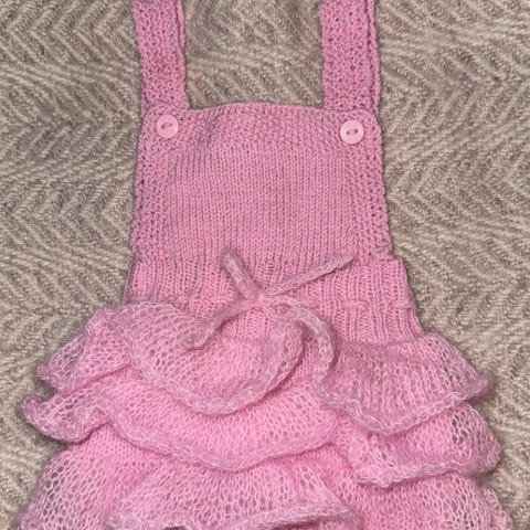 Hjemmestrikket lille sukkerspinn romper i brun. Pent brukt, ser helt fin ut. Ingen hull, nupper eller flekker. Passer fra ca 6 mnd.