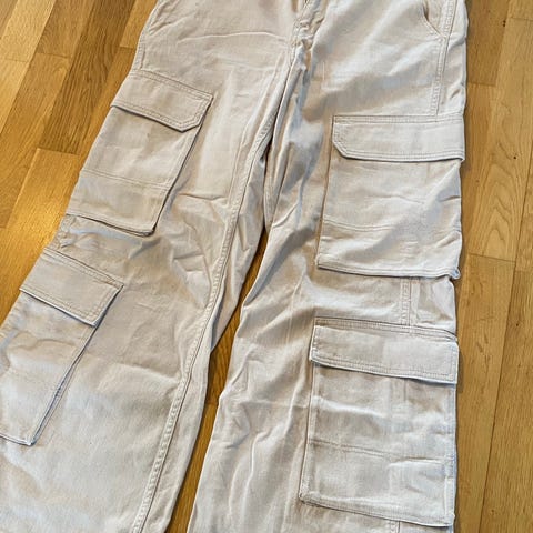bukse i størrelse L, laget av polyester. Bukser i beige farge med lommedetaljer og snøring ved benavslutningene.