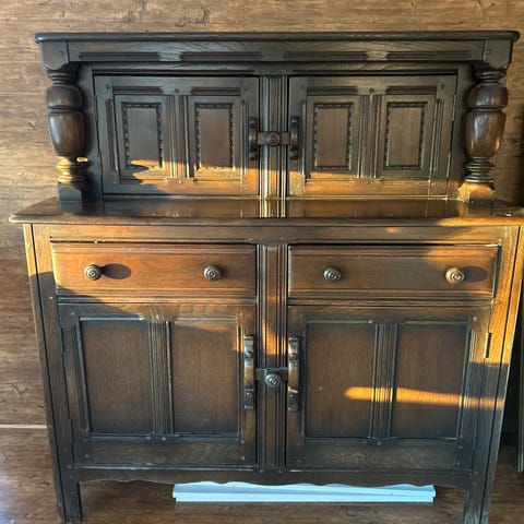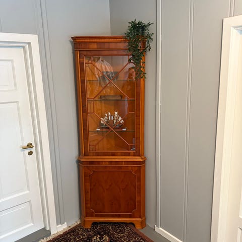 Solid møbel. To hyller med skuffer som kan stå alene, ved siden av hverandre eller i hjørne med medfølgende hylleplater (trolig ikke originale.) Skuffen glir fint. Noen av håndtakene/knottene på skuffene er ødelagt. Hyllene kan males.