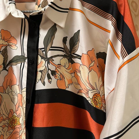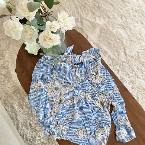 Behagelig og sommerlett bluse i morsomme farger. Blusen har vide ermer og knyting i livet som gjør at den sitter pent i midjen. Som ny,ingen slitasje.