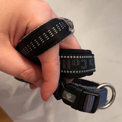 Caninetto hundehalsbånd i mørk brun og beige farge. Halsbåndet har justerbar størrelse med borrelås og metallring for feste. Materialet er polstret for komfort.