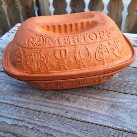 Praktisk leirgryte som er glasert på innsiden. Passer til brød, gryteretter og lignende.