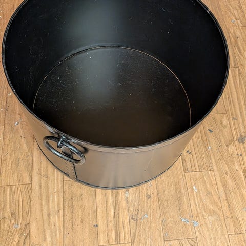 Sort vedkurv på hjul m/peissett. Solid utførelse i lakkert stål. Høyde (m/hjul) 55cm, bredde ca 30cm, dybde ca 33cm.