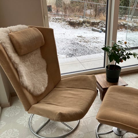 To gode liggestoler en e fin og hel en har en rift i skinnet på armlenet og mangler en skrue under