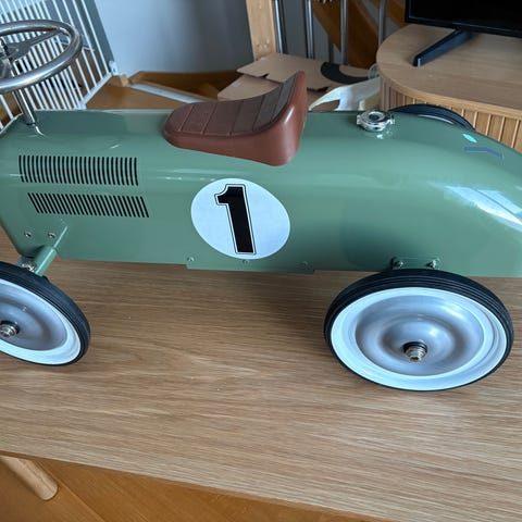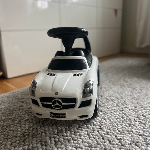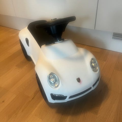 Denne kule sittebilen ligner en ordentlig bil. Faktisk så ligner den på en skikkelig Porsche! Bilen har store hjul med gummibelegg, hjulkapsler, et fungerende bilhorn og stilige detaljer i Porche-logoen i front og frontlykter. Barnet sitter på et solid sete og styrer enkelt bilen ved hjelp av rattet. Sittebilen er stødig og enkel for de små å håndtere, og kan bidra til timevis med moro!
