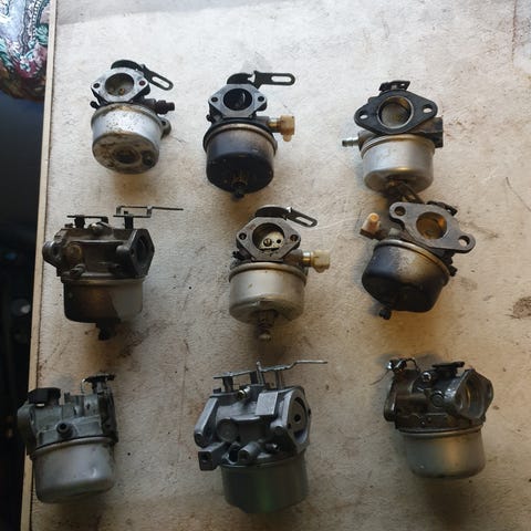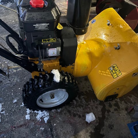 Snapper snøfreser med bensinmotor. Utstyrt med håndtak for styring og hjul for enkel manøvrering.