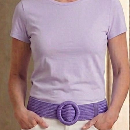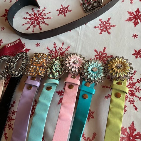 To fine belter i lilla og oransje farge med dekorative mønstre. Beltene har spenner i samme farge som remmen og flere hull for justering. Materialet er i tekstil i både beltet og utenpå beltespennen.
