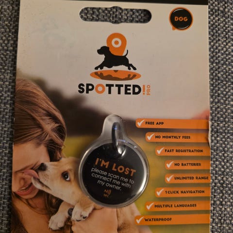 Spotted! Pro er en digital ID-brikke for hunder og katter som bruker NFC-teknologi og QR-koder for å hjelpe eiere med å gjenforenes med bortkomne kjæledyr.