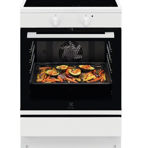 Electrolux induksjon komfyr med glasskeramisk koketopp og ovnsfunksjon. Komfyren har flere kokeplater med induksjonsteknologi og ovnsrom med flere riller for justering av stekebrett. Rustfritt stål frontpanel med knapper for temperatur- og funksjonskontroll.