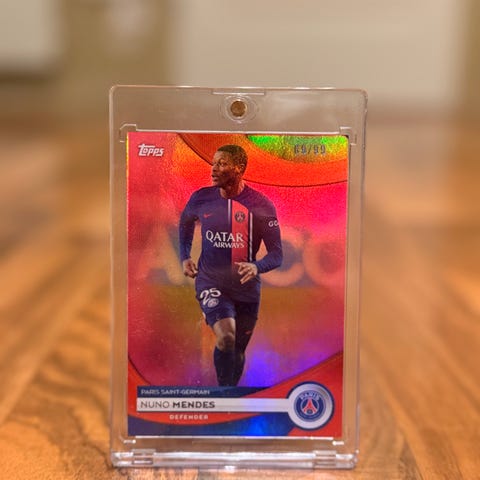 Samling av fotballkort med kjente toppspillere fra Champions League. Kortene viser spillere i ulike klubbdresser og inkluderer spesialkort med holografiske og fargede effekter. Kortene er beskyttet i plastlommer for å bevare tilstanden.