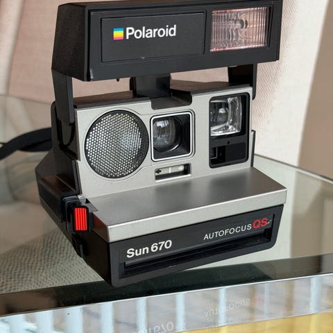 Polaroid SLR 680 kamera i svart farge. Analog instant-kamera med innebygd blitz og sonar autofokus.