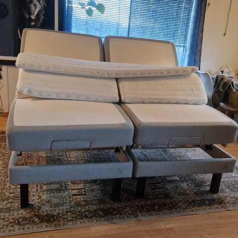 Sengen står på 20 cm høye ben og har medium fasthet.
