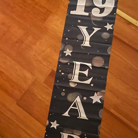 Selger en veldig pent brukt wall banner for 10års dag i størrelse 205*105. Henges opp med tegnestifter eller kartnål