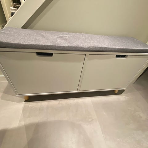1. En kommode med ryggstøtte og skooppbevaring, 100 x 35 x 52 cm (lengde x bredde x høyde).
