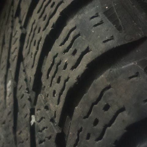 Et par piggdekk med 5-6 mm. Litt mer slitt på sida, ca 4mm. Godt med pigger