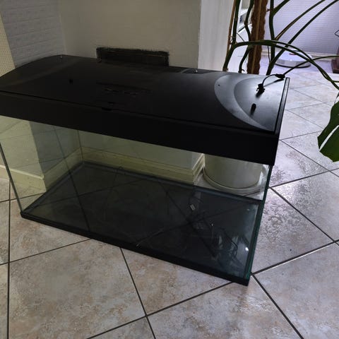 Akvarium med stativ laget av metall og glass. Består av flere koblede akvarier plassert på et metallstativ. Egnet for oppdrett eller oppbevaring av akvatiske dyr. Farge på stativ er sølvfarget metall, glass er gjennomsiktig.
