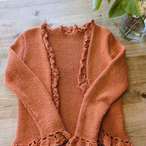 Søt og varm cardigan / strikket jakke i 55% Ramie og 10% Angora (og nylon) fra ONLY. Fint strikkemønster i dempet, gammelrosa farge. Jakka er fin åpen også.