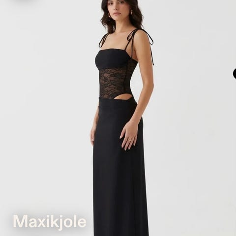 Bershka Maxikjole festkjole i svart farge, størrelse M, men kan være også S for kvinner. Laget av polyester materiale. Maxikjolen har utskjæringer og er designet for festlige anledninger. Selger da den ikke ble brukt.