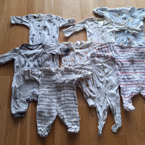 6 pysjer i str 50. De to grønne er str 56, men små i størelsen. Merker er lindex, kappahl og nameit.