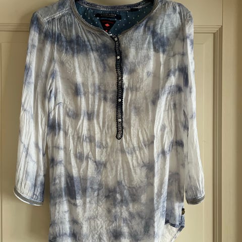 Michael Kors bluse i størrelse M. Blusen har blå farge og et mønster som gir et dekorativt uttrykk. Den er designet for kvinner og har en løs passform med snøring foran i nederkant.