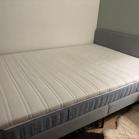 Selger en dunvik IKEA kontinentalseng grunnet flytting. 160cm. Hodegavl og overmadrass kan følge med. Kjøpt i 2024. Brynlien-bein på sengen.