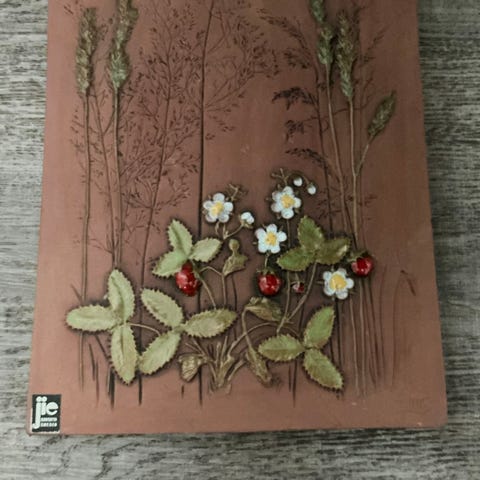 Plakettene er merket SOLTUN B.K – VÅGÅ og NORGE. Utført i terrakotta med glasert blomsterdekor i relieff. Klassisk norsk brukskunst, trolig fra 1970–80-tallet.