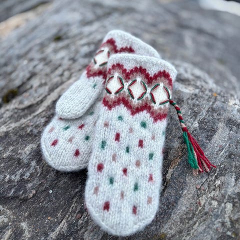 Flotte pastellfarger, og med en lovikka dekor påsydd. Vottene er også børstet innvendig for bedre isolasjon, så dette er tykke og varme votter.