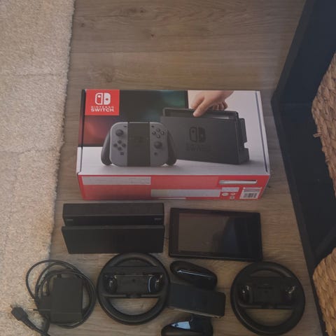 Nintendo Switch konsoll med Joy-Con kontroller i blå og rød. Konsollen inkluderer håndleddsreimer, Joy-Con grip, og dokkingstasjon.