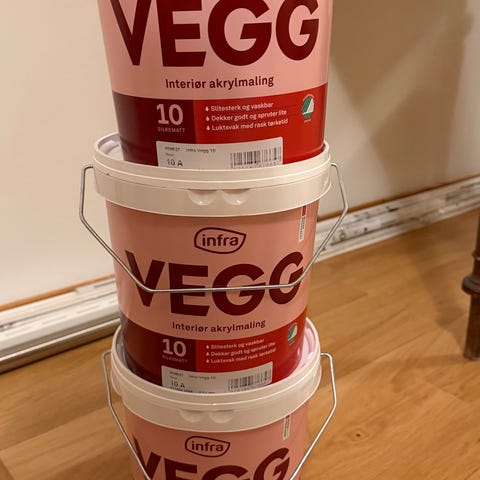 Vi har brukt en lengde, ca. 2,50cm før vi så at denne løsningen ikke blir optimal hos oss. Kan også få med 5liter Nordsjø våtromslim beregnet å feste veggfornyer for 150kr, kun brukt tilsvarende mengde for å feste en remse