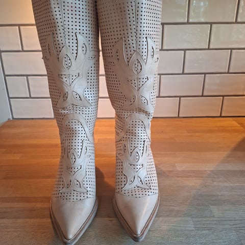 Tamaris hæler i størrelse 36, laget av rødt skinn. Skoene har kilehæl og dekorative metallringer. Passer for damebruk.