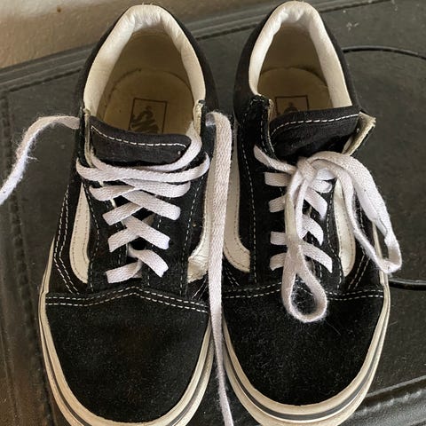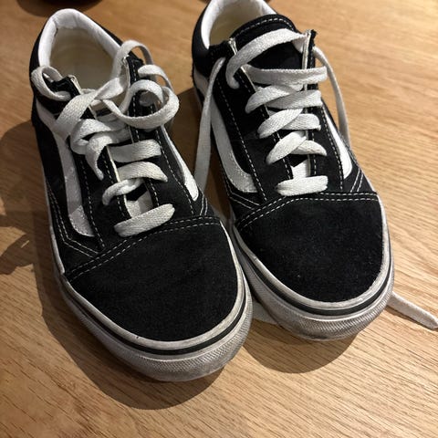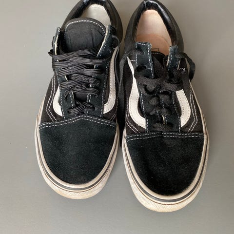 Vans unisex sko i størrelse 38 med svart og hvit farge. Skoene har klassisk Vans design med hvite lisser og gummisåle med mønster for grep.