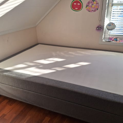 Jysk sengramme med trerammer og svart trekk. Passer til enkeltsengstørrelse. Rammen er laget av tre og har et svart trekk som dekker overflaten.