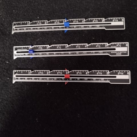 Målestaver i plast med størrelser fra 0,5 cm til 5 cm. Hver målestav har en tydelig markering for måleverdien. Settet inkluderer flere målestaver festet sammen med en plastløkke for enkel oppbevaring og bruk.