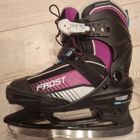 Godt brukte Frost skøyter i justerbar barnestørrelse 28-31. Fargekombinasjonen er svart og blå. Er hele og i god stand, men noen detaljer er slitt delvis bort.