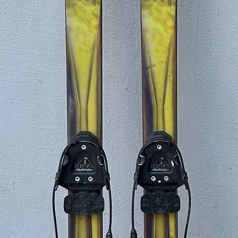 Åsnes Extreme telemarkski, lengde 200 cm. Skiene har 75 mm Rottefella Riva binding til fjell-/telemarkstøvler.
