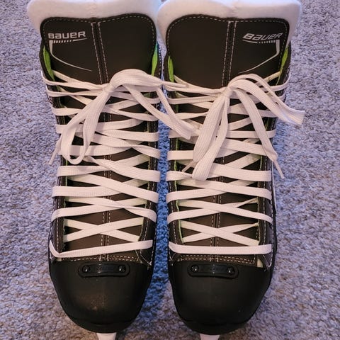 Bauer Supreme ishockeyskøyter i størrelse 36. Skøytene er svarte med hvite og gule detaljer. Egnet for ishockeybruk.