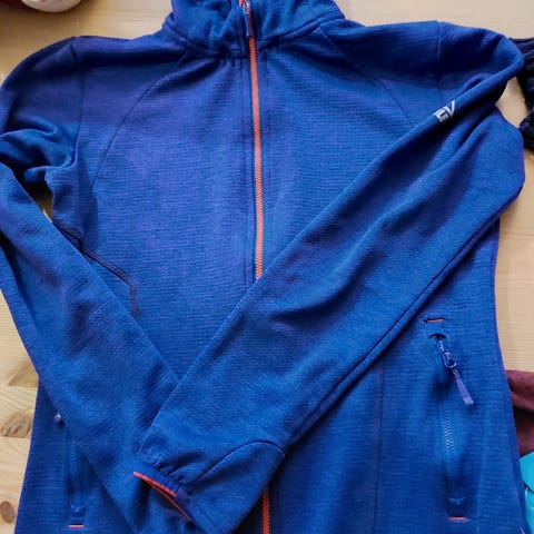 Pen lilla jakke. Vattert. To knøttsmå hull på ene arma (gnist fra bål). Ikke synlig.