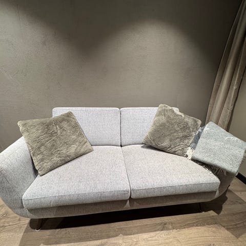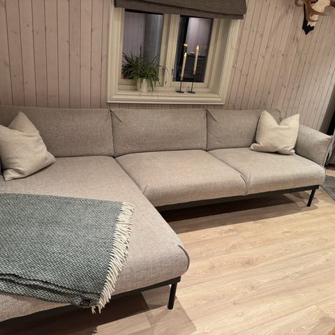 Sofa ble kjøpt i 2018. Den har enkelte bruksflekker, men trekkene kan tas av og vaskes.