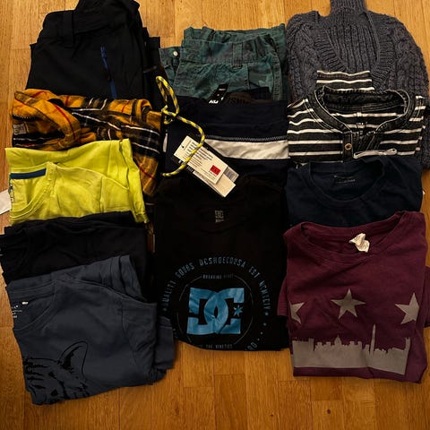 Stor klespakke til gutt i str 158 selges 230kr + porto (69kr med postnord). Noen klær er nye med lappen fortsatt på. Pakken inneholder 1 sort dressbukse, 1 lys blå penskjorte, 1 ubrukt joggebukse, 1 puma hettegenser, 1 helt ny jeans med lappen på, 1 helt ny fleecejakke med lappen på, 1 t-skjorte og 3 shortser (trening, bading og finshorts).