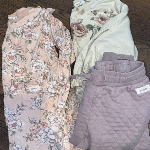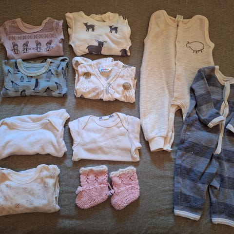 Fem bodyer, tre strømpebukser og en Lillelam-pysj. Klærne er ubetydelig brukt. Flekker kan forekomme, men ser ingen selv i farten.