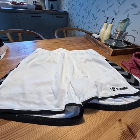 Hummel sportsshorts for menn i størrelse M. Shortsen er blå med hvite detaljer på sidene, laget for sport og fritid.